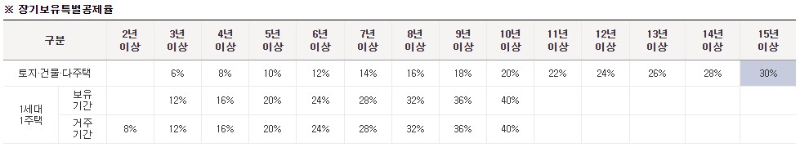 1세대 1주택인 경우 거주기간 2년(8%), 보유기간이 3년 이상(12%)부터 최장 10년 이상(40%)까지 양도차익을 줄일 수 있으므로 10년 이상 보유하는 것이 유리하다. 토지·건물·다주택자의 경우는 보유기간 3년 이상(6%)부터 최장 15년 이상(30%)까지 장기보유특별공제를 받을 수 있다.